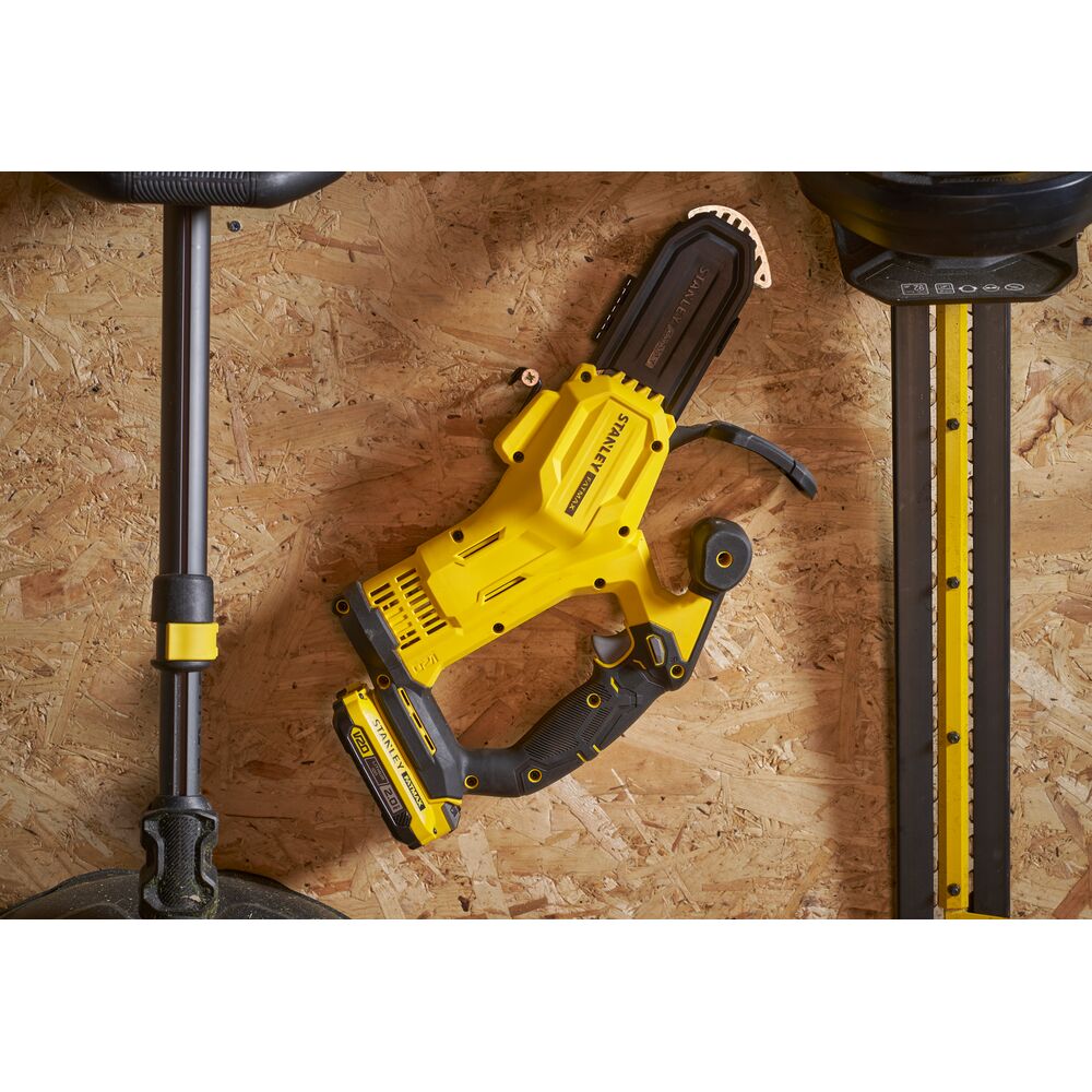 STANLEY FATMAX V20 18V акумулаторска пила за кастрење (15 cm / 6″) – компактна градинарска пила со дворачна рачка и заштитен штитник на врвот за поголема контрола и безбедност. Работи без масло (oil-free) благодарение на ниската брзина на синџирот и има заклучување lock-off против ненамерно стартување.