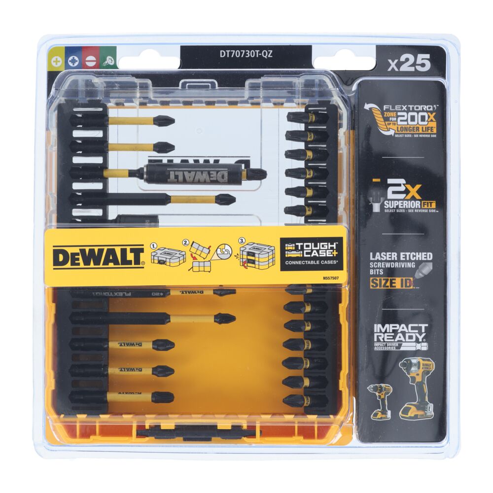 Краток опис: Сет од 25 битови EXTREME® FlexTORQ, дизајнирани за големи моменти со ударни алати. Сите битови имаат торзиона зона што ја апсорбира врвната сила, прецизен и стабилен прифат во завртките, и компактен TOUGHCASE кој се вклопува во TSTAK системот.