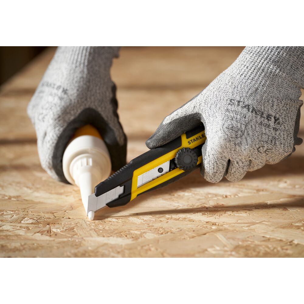 STANLEY® 18 мм snap-off нож со регулатор (тркалце) за заклучување и интегриран механизам за кршење на сегментите – брзо, едноставно и безбедно обновување на острицата со една рака. Нерѓосувачка водилка/шина на сечивото за долг век, лесно подесување на излезот на сечивото и отвора за ременче на рачката.