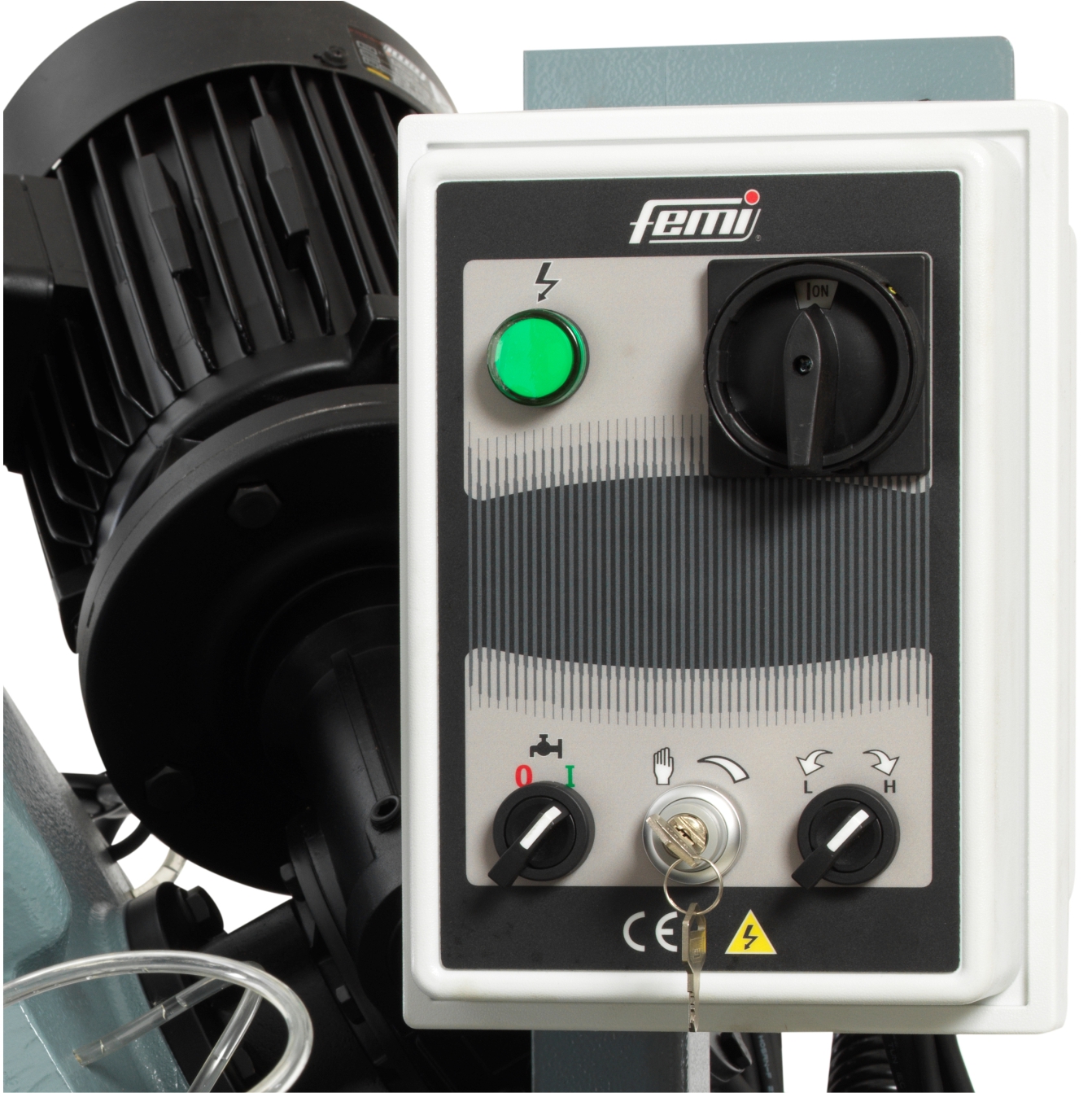 - FEMI N310 DA DG е професионална стационарна лентаста пила за метал, со автоматски хидрауличен систем за спуштање и моќен трифазен мотор. Главните предности се голем капацитет на сечење, прецизност и издржливост.