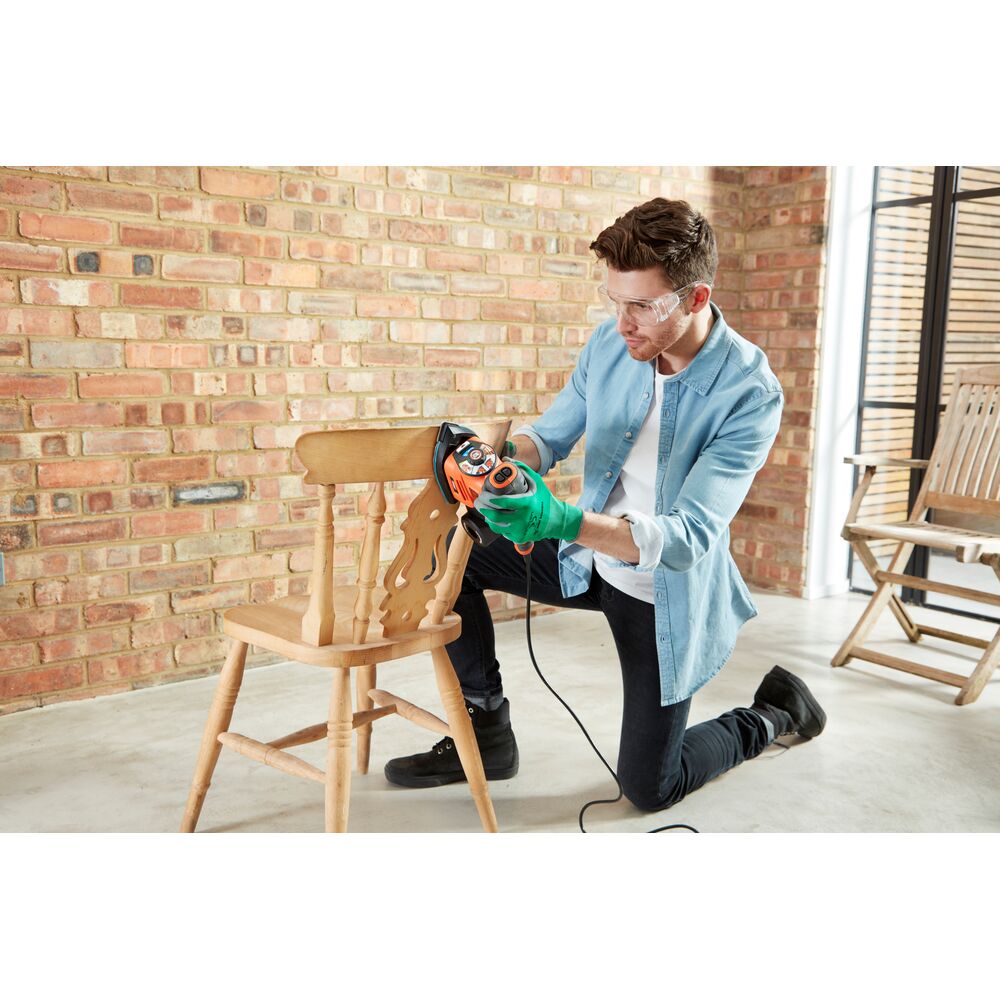 BLACK+DECKER KA280K-QS е мултифункционална 4-во-1 брусилка со моќност од 220W, наменета за разновидни задачи на брусење и фино обработување на различни материјали. Благодарение на заменливите основи за брусење, алатката може да се користи како орбитална, ексцентарска и детална брусилка, што ја прави исклучително практична за домашни работилници и DIY проекти.